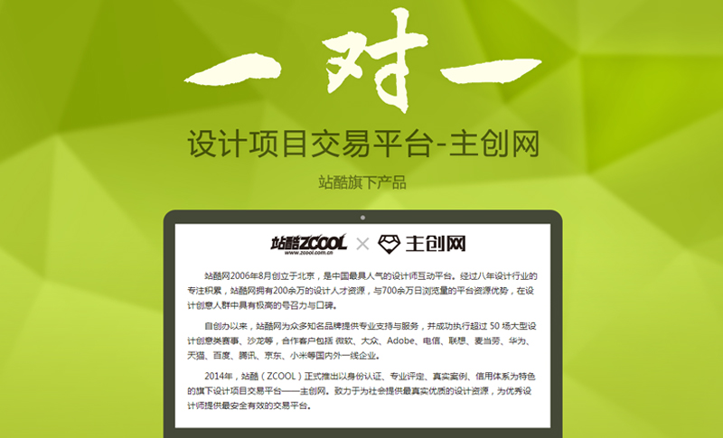 2014年,站酷(ZCOOL)正式推出以身份認證、專業(yè)評定、真實案例、信用體系為特色的旗下設計項目交易平臺——主創(chuàng)網(wǎng)。致力于為社會提供最真實優(yōu)質(zhì)的設計資源,為優(yōu)秀設計師提供最安全有效的交易平臺。