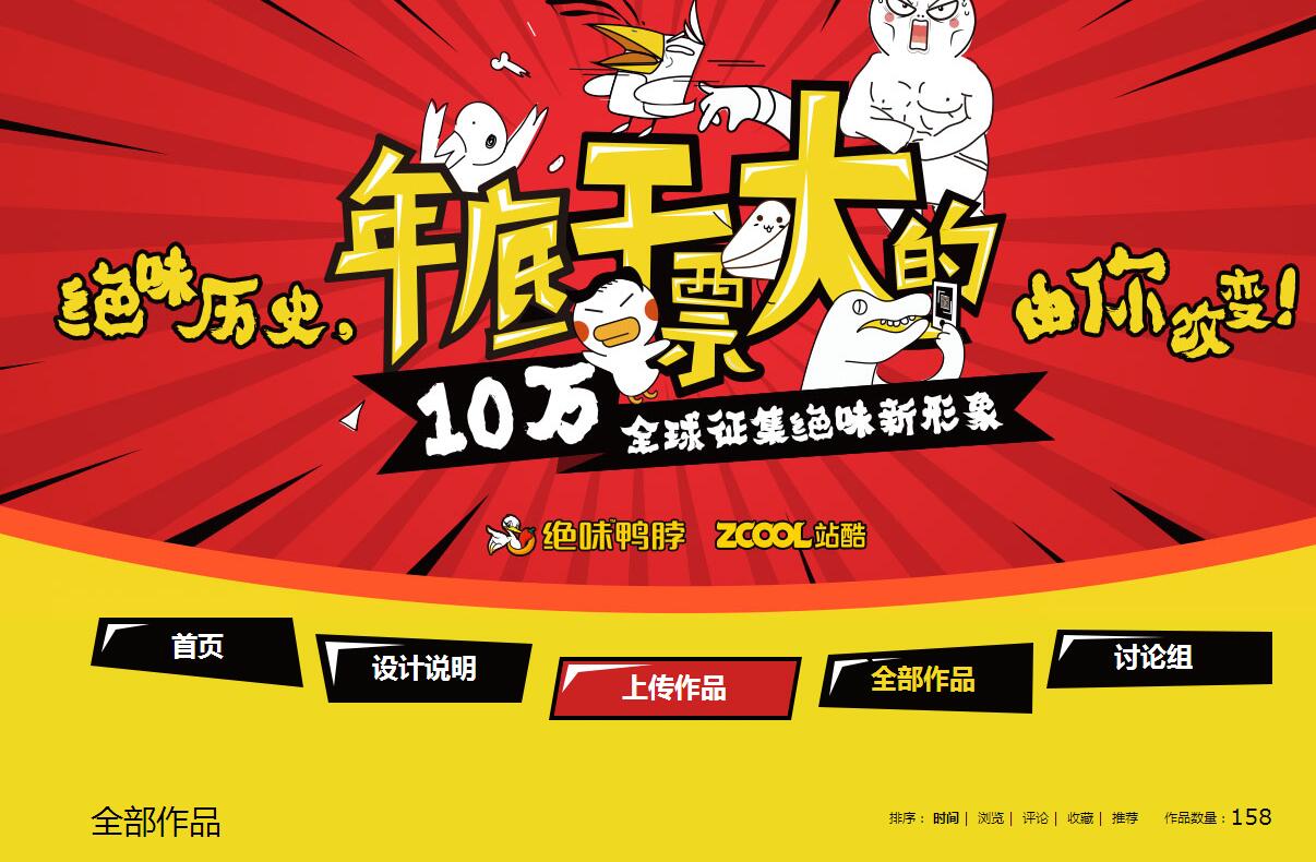 今天不小心打開站酷的頁面,發(fā)現(xiàn)了一篇征集的文章,然后打開一看,原來是絕味的品牌形象征集,出了10萬塊的征集押金,然后站酷就在上面打上廣告:年底了干一票大的。接著你再往下看,最佳獎(jiǎng)5萬,而且前提是無償競稿,誰愛做誰就上傳作品,這個(gè)看了就是給到學(xué)生們很大的發(fā)展空間,但是我相信不會(huì)有幾家專業(yè)的設(shè)計(jì)公司會(huì)看上這5萬塊錢的最佳獎(jiǎng)而去嘗試無償?shù)母偢?,這里很多客戶又會(huì)在說,如果覺得自己有實(shí)力,何必在乎,這句話翻譯過來就是坐著說話不腰疼,你試下您的產(chǎn)品,先給消費(fèi)者吃完,好吃再給錢。